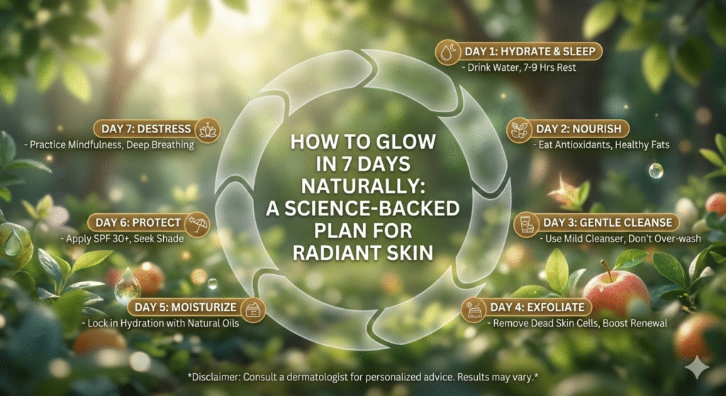 If you’re wondering how to glow in 7 days naturally, the answer lies in simple, science-backed daily habits, not quick fixes. While lasting skin health takes time, this 7-day plan can noticeably improve brightness, hydration, and overall glow—naturally and safely.